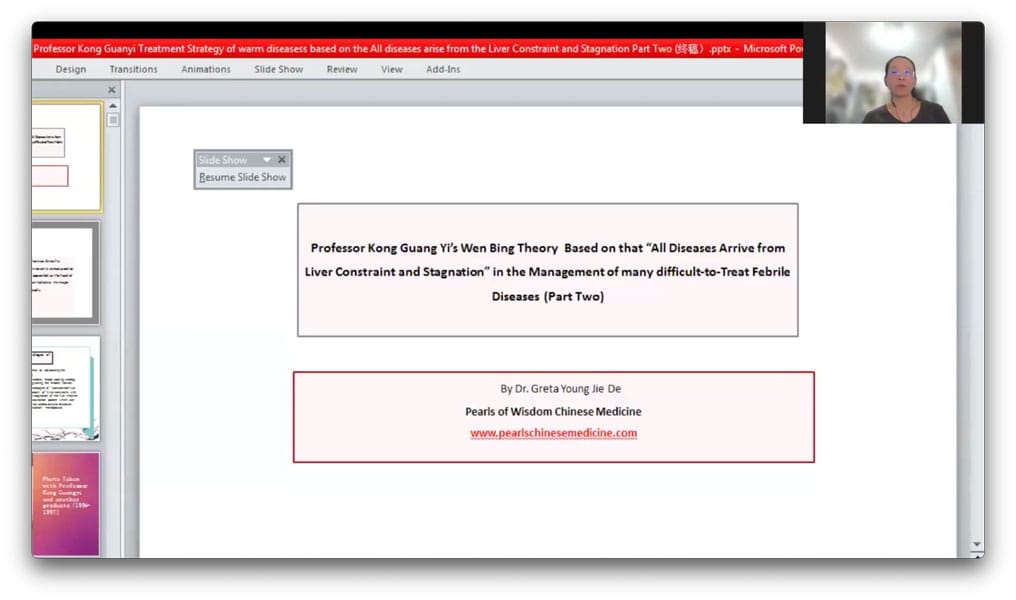 Video recordings of the May 2025 webinar on Chinese Medicine Wen Bing treatment strategy, hosted by Pearls of Wisdom Chinese Medicine, presented by Dr. Greta Young Jie De (Ph.D) and Professor Kong Guang Yi (孔光一教授).